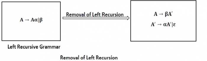 上述文法是左遞迴的,因為產生式的左側出現在產生式右側的第一個位置。可以透過用以下一對產生式替換它來消除左遞迴