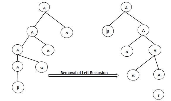 在左遞迴文法中,A 的展開將在每一步生成 Aα、Aαα、Aααα,導致它進入無限迴圈。