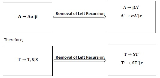將 T → T, S|S 與 A → A α | β 進行比較,其中 A = T,α =, S,β = S