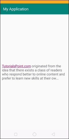 }在上面的程式碼中,我們給出了文字檢視並添加了一些文字。在該文字中,我們給出了一個url為tutorialspoint.com。要在Android中呼叫linkify,我們必須呼叫linkify.addLinks(),在這個方法中,我們必須傳遞textview和LinkifyMask。