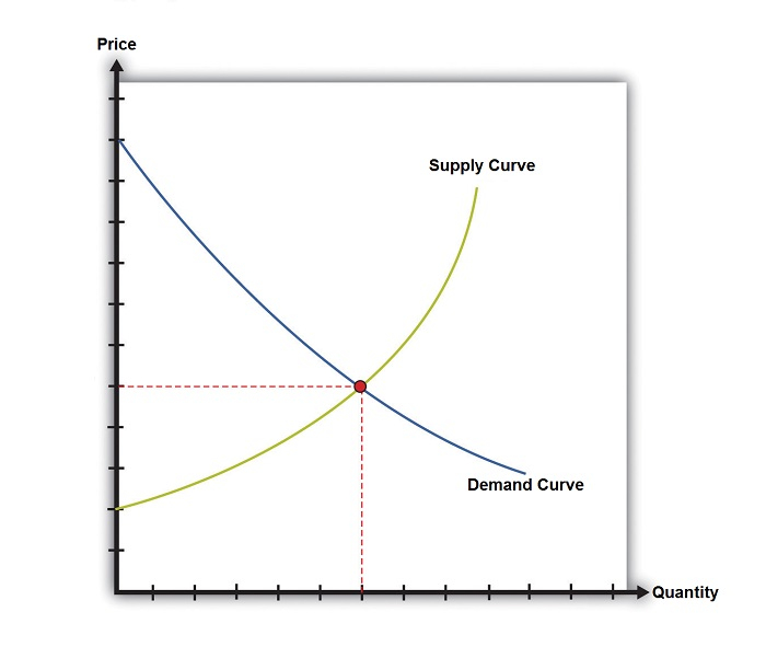 兩條曲線——一條向下傾斜的需求曲線,標註為“D”,一條向上傾斜的供給曲線,標註為“S”。