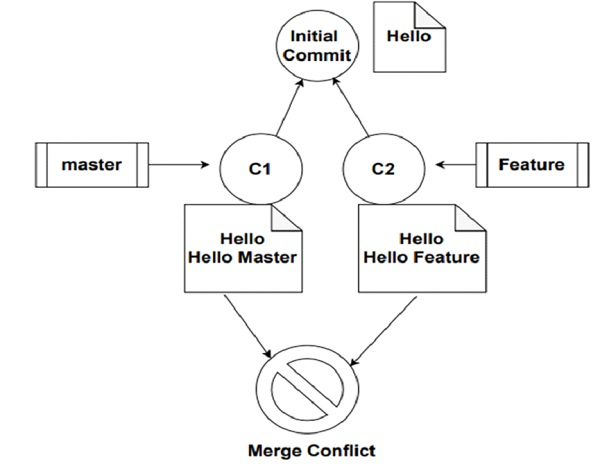 下圖顯示了兩個分支master和feature。檔案hello.txt最初包含一行 Hello。初始提交後,由於它們具有單獨的提交,分支已分叉。每次提交都修改了檔案中同一行。