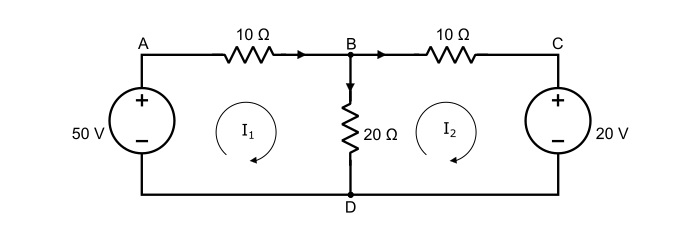 $$\mathrm{50-10\mathit{I}_{1}-20(\mathit{I}_{1}-\mathit{I}_{2})=0}$$