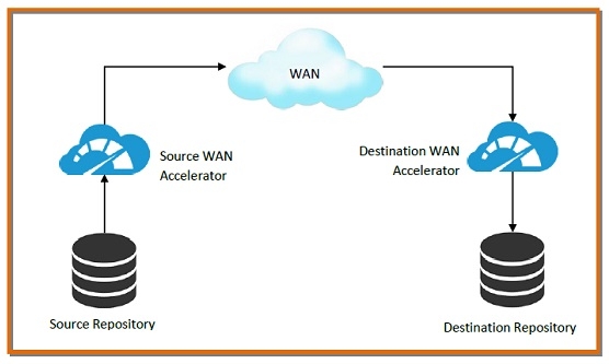 網路加速是透過部署網路加速器(也稱為廣域網加速器)來實現的。它可以是硬體元件、軟體或在虛擬化環境中執行的裝置。廣域網加速器部署在通訊雙方靠近其備份儲存庫的每一端。源廣域網加速器儲存資料以及用於全域性重複資料刪除的控制資訊。目標廣域網加速器儲存全域性快取資料。