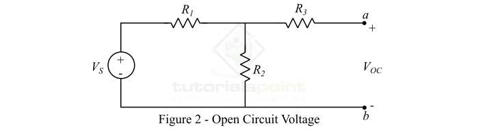 步驟1 - 我們將負載𝑅𝐿從電路中移除,並將開路端子之間的電壓標記為𝑉OC,如圖2所示。