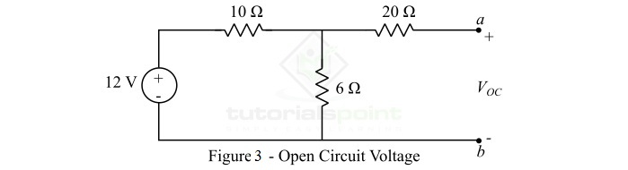 在給定電路中,開路電壓等於6Ω電阻上的電壓,因為沒有電流流過20Ω電阻。因此,使用分壓規則,我們得到: