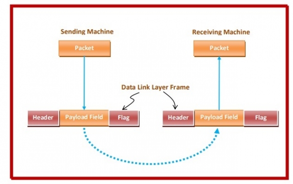 下圖描繪了資料鏈路層幀中的有效載荷欄位的封裝。上層的資料包透過新增一個包含用於資料傳輸的控制資訊、包含實際資料的有效載荷欄位和標記資料幀結尾的結束標誌的頁首來成幀。