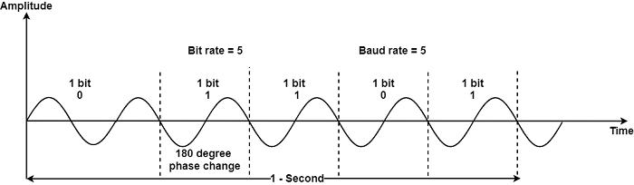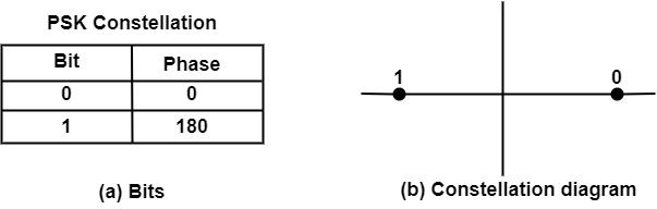 在相移鍵控 (PSK) 中,載波相位不同以描述二進位制 1 或 0。在此過程中,峰值幅度和頻率保持不變。例如,如果我們以 0 度開始定義二進位制 0,我們可以將該過程調整為 180 度來傳輸二進位制 1。在每個位元持續時間內,訊號相位是固定的,其成本基於位元 (0 或 1)。