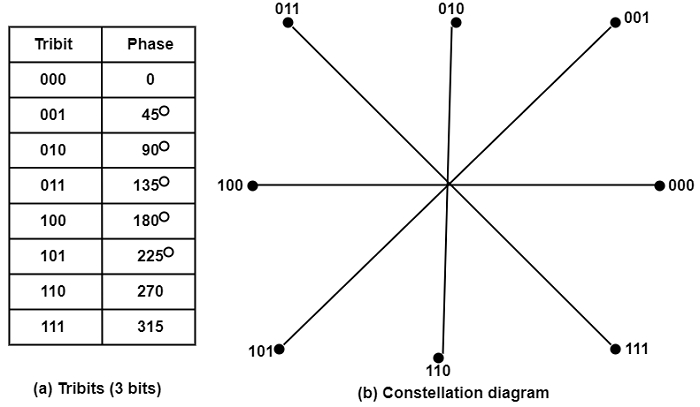 該圖顯示了相移和三位元之間的關係。每一個都代表 8-PSK,效率是 2-PSK 的 3 倍。