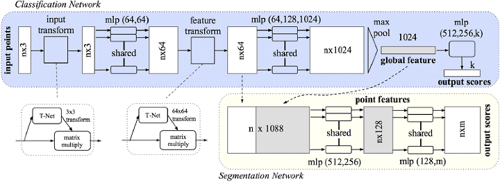 下圖顯示了 PointNet 架構的視覺化表示。分類網路的輸入中有 n 個點。在應用輸入和特徵變換後,它使用最大池化聚合點特徵。此過程的結果是,m 個預定義類別將接收分類分數。該架構透過連線全域性和區域性特徵來擴充套件分割任務。多層感知器由表示法“mlp”表示,其中層大小由括號指示。對於最終的多層感知器,使用整流線性單元 (ReLU) 對所有層應用批次歸一化。