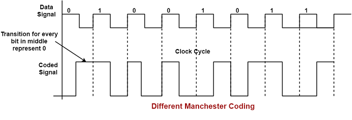 此編碼系統在位元間隔的中間始終存在一個變化。空格或二進位制“0”在位元間隔的開始處有一個額外的轉換。