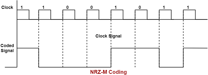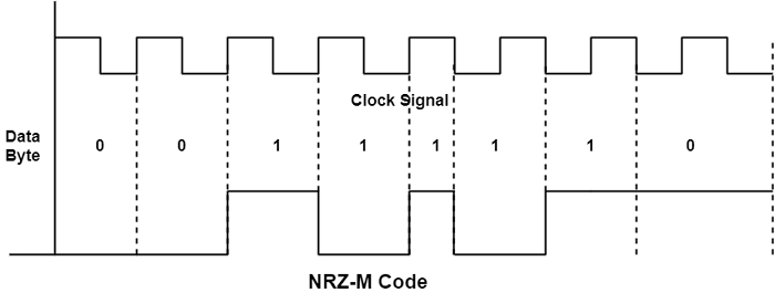 在這種編碼中,“1”表示標記,“0”表示空格。訊號電平僅在標記(即“1”)時發生變化。該圖顯示了資料 11001011 的 NRZ-M 碼。