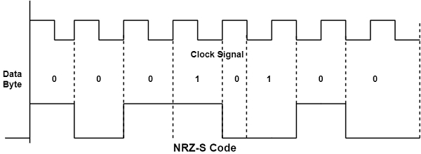 此編碼與非歸零標記非常相似。唯一的變化是訊號僅在空格(即“0”)時發生變化,而在標記(即“1”)時保持恆定。該圖顯示了資料 11001011 的 NRZ-S 碼。