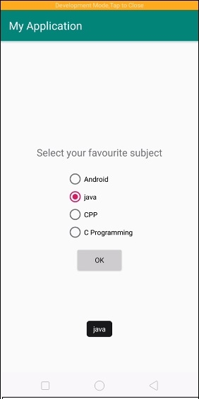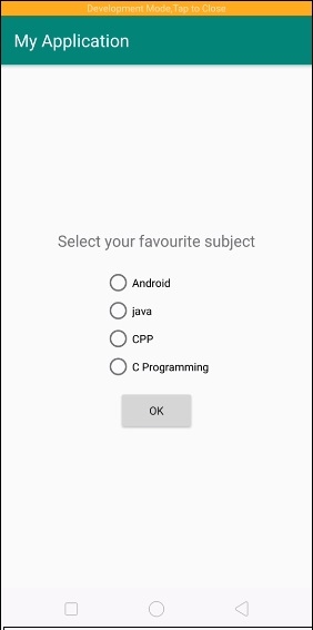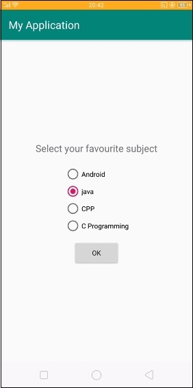 <?xml version="1.0" encoding="utf-8"?> <LinearLayout xmlns:android="http://schemas.android.com/apk/res/android" xmlns:app="http://schemas.android.com/apk/res-auto" xmlns:tools="http://schemas.android.com/tools" android:layout_width="match_parent" android:layout_height="match_parent" android:gravity="center" android:orientation="vertical" tools:context=".MainActivity"> <TextView android:id="@+id/result" android:layout_width="wrap_content" android:layout_height="wrap_content" android:text="Select your favourite subject" android:textSize="20sp" android:padding="10dp" app:layout_constraintBottom_toBottomOf="parent" app:layout_constraintLeft_toLeftOf="parent" app:layout_constraintRight_toRightOf="parent" app:layout_constraintTop_toTopOf="parent" /> <RadioGroup android:id="@+id/radioGroup" android:layout_width="wrap_content" android:layout_height="wrap_content" android:padding="10dp"> <RadioButton android:id="@+id/adroid" android:layout_width="wrap_content" android:layout_height="wrap_content" android:text="Android"/> <RadioButton android:id="@+id/java" android:layout_width="wrap_content" android:layout_height="wrap_content" android:text="java"/> <RadioButton android:id="@+id/cpp" android:layout_width="wrap_content" android:layout_height="wrap_content" android:text="CPP"/> <RadioButton android:id="@+id/clan" android:layout_width="wrap_content" android:layout_height="wrap_content" android:text="C Programming"/> </RadioGroup> <Button android:id="@+id/buton" android:text="ok" android:layout_width="wrap_content" android:layout_height="wrap_content" /> </LinearLayout>