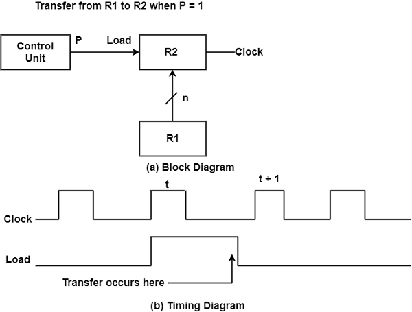 控制條件以冒號結尾。它表示硬體僅在 P = 1 時才執行傳輸操作的規範。用暫存器傳輸表示法編寫的每個語句都指示用於執行傳輸的硬體結構。