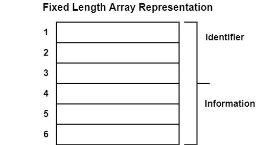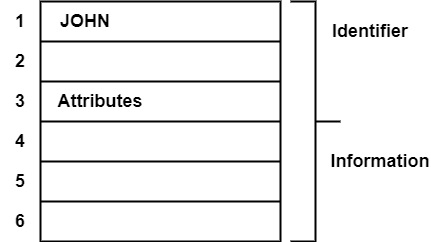 假設每個塊只能儲存 4 個字元。因此,我們需要 2 個塊來儲存識別符號,4 個塊來儲存其資訊。