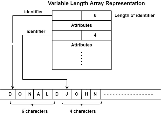 它不會將名稱直接儲存在符號表中,而是將所有名稱儲存在一個獨立的字元陣列中,並且只保留名稱的起始索引和長度。這將克服定長名稱的缺點。現在它可以具有超過 8 個字元的可變長度,因為在以前的方法中它是固定的。類似地,我們可以將前面的示例表示為
