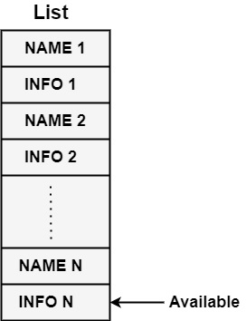 它可以使用單個數組或多個等效陣列來儲存名稱及其相關資料。新名稱按遇到的順序插入列表中。可以從陣列的開頭搜尋到指標AVAILABLE標記的位置(表示陣列空閒部分的開頭)來檢索關於某個名稱的資料。