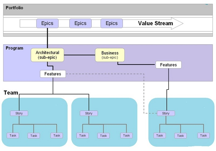 上圖描述了敏捷流程。史詩(Epic)是一大塊工作,被分成許多小的故事或子史詩。這些子史詩被分配給每個團隊作為故事,然後團隊圍繞這些故事開展工作。
