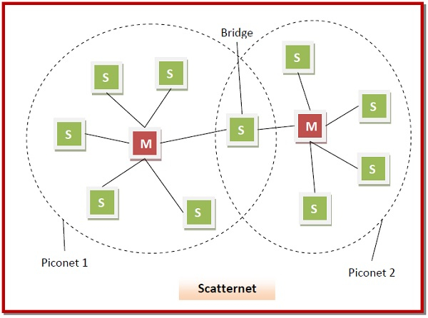 下圖顯示了兩個微微網組成的散射網。此處,橋接既是連線網路中各個主節點的微微網中的一個主節點,又是微微網中的從節點。