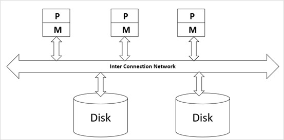 **共享磁碟架構** - 在此架構中,每個節點都有自己的主記憶體,但所有節點共享大容量儲存。實際上,每個節點也具有多個處理器。所有處理器都可以透過互連網路直接訪問所有磁碟,每個處理器都有其私有記憶體。