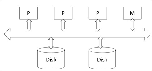 共享記憶體多CPU - 在這種計算機中,多個同時活動的CPU連線到互連網路,並共享單個主記憶體和一個公共磁碟儲存陣列。這種架構對於實現中等程度的並行性很有吸引力,因為可以利用數量有限的CPU。