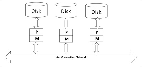無共享架構 - 在此架構中,每個節點都有自己的海量儲存和主記憶體。處理器在一個節點上可以透過高速互連網路與另一個節點上的另一個處理器通訊。每個處理器都有自己的作業系統、資料庫管理系統 (DBMS)和資料副本,因此每個節點都作為其擁有磁碟或磁碟上資料的伺服器。