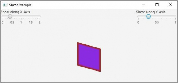 下面的JavaFX示例演示了剪下變換。它包含一個二維幾何形狀和兩個滑塊,分別表示x和y傾斜值。如果移動滑塊,則物件會沿選擇的軸線傾斜。