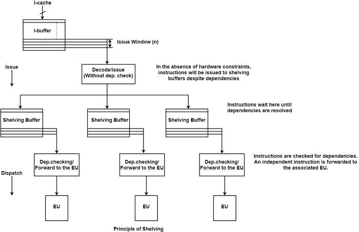 更準確地說,使用擱置,即使存在資料或控制依賴關係或執行單元繁忙,解碼後的指令也會被放入擱置緩衝區。這消除了阻塞指令發出的瓶頸。