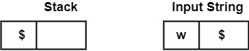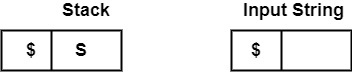 接受:重複步驟3和步驟4,直到檢測到錯誤或棧包含開始符號 (S) 且輸入緩衝區為空,即包含 $。