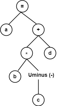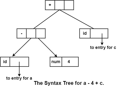 mkleaf (num, val) - 它生成一個帶有標籤 num 的數字節點,以及包含 val 的欄位,val 是數字的值。例如,為表示式 a − 4 + c 構建語法樹。在這個序列中,p1、p2、……p5分別是指向識別符號 'a' 和 'c' 的符號表條目的指標。