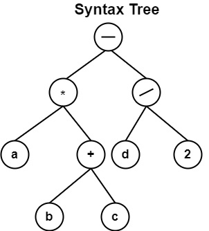 示例 5 - 為以下算術表示式 a * (b + c) – d /2 繪製語法樹。此外,將給定表示式寫成字尾形式。