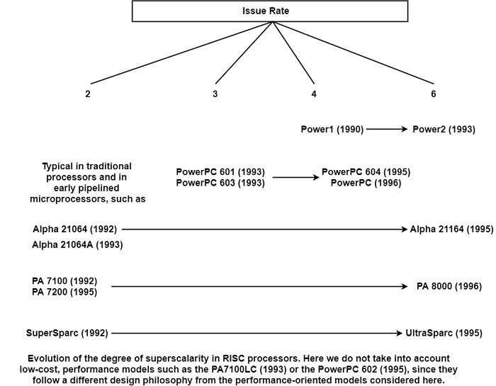 此圖顯示了五個特定 RISC 系列中發出率的演變。第一代 α 處理器 (α 21064 和 α 21064A) 和 HP 精確架構系列 (PA 7100、PA 7200) 的第一個超標量成員被控制為每個週期發出兩條指令。