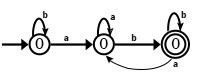DFA示例 每個狀態都有唯一的輸入符號 Σ = {a, b} 從中發出。 | NFA示例 因為狀態0上存在輸入符號'a'的多個轉換。並且狀態2沒有轉換,即非確定性的。 |