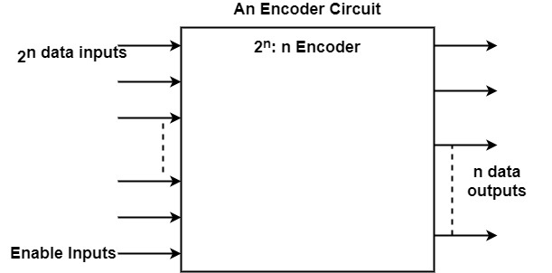 執行解碼器逆運算的數位電路稱為編碼器。它具有 2n 個輸入線和 n 個輸出線。在編碼器中,輸出線建立與輸入值等效的二進位制程式碼。該圖顯示了編碼器電路的通用架構。