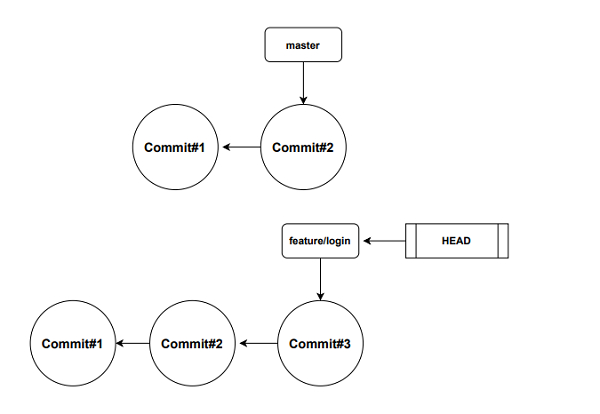 此外,當我們有多個分支時,HEAD有助於找出我們當前正在處理哪個分支。下圖有兩個分支,第一個是master分支,另一個是功能分支。現在要想知道我們正在處理哪個分支,只需檢查HEAD指標即可。