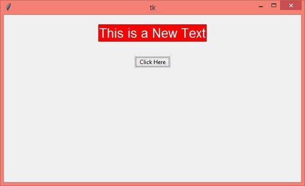 #Import the tkinter library from tkinter import * from tkinter.ttk import * #Create an instance of tkinter frame win = Tk() #Set the geometry win.geometry("620x400") #Add a class to style the tkinter widgets style = ttk.Style() style.configure('TEntry', foreground = 'red') #Define a function to change the text color def change_color(): text.configure(background="red") #Create a text widget text=Label(win,text="This is a New Text",foreground="white", background="blue",font=('Aerial bold',20)) text.pack(pady=20) #Create a Button widget Button(win, text= "Click Here", command= change_color).pack(pady=10) win.mainloop()