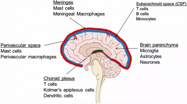 人腦主要由神經元、神經膠質細胞和血管組成。神經元有各種型別,包括中間神經元、錐體細胞(包括貝茨細胞)、運動神經元和小腦浦肯野細胞。貝茨細胞是神經系統中最大的細胞。據評估,成年人腦中含有 86 ± 80 億個神經元和 85 ± 100 億個非神經元細胞。在這些神經元中,160 億 (19%) 位於大腦皮層,690 億 (80%) 位於小腦。