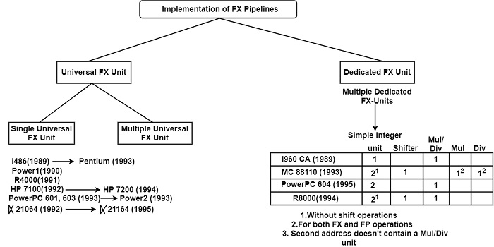 除了早期的1960 CA之外,這些處理器通常包含兩個簡單的FX單元(提供乘法/除法功能),並使用公共專用乘法器/除法器單元(如PowerPC 604或R8000)或幾個單獨的乘法器和一個單獨的除法器(如MC 88110)來實現多週期整數運算。