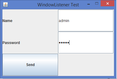 import java.awt.*; import java.awt.event.*; import javax.swing.*; public class WindowListenerTest extends JFrame implements WindowListener { JLabel l1,l2; JTextField t1; JPasswordField p1; JButton b1; public WindowListenerTest() { super("WindowListener Test"); setLayout(new GridLayout(3,2)); l1 = new JLabel("Name"); l2 = new JLabel("Password"); t1 = new JTextField(10); p1 = new JPasswordField(10); b1 = new JButton("Send"); add(l1); add(t1); add(l2); add(p1); add(b1); addWindowListener(this); } public static void main(String args[]) { WindowListenerTest wlt = new WindowListenerTest(); wlt.setSize(375, 250); wlt.setResizable(false); wlt.setLocationRelativeTo(null); wlt.setVisible(true); } public void windowClosing(WindowEvent we) { this.setVisible(false); System.exit(0); } public void windowActivated(WindowEvent we) { } public void windowDeactivated(WindowEvent we) { } public void windowOpened(WindowEvent we) { } public void windowClosed(WindowEvent we) { } public void windowIconified(WindowEvent we) { } public void windowDeiconified(WindowEvent we) { } }