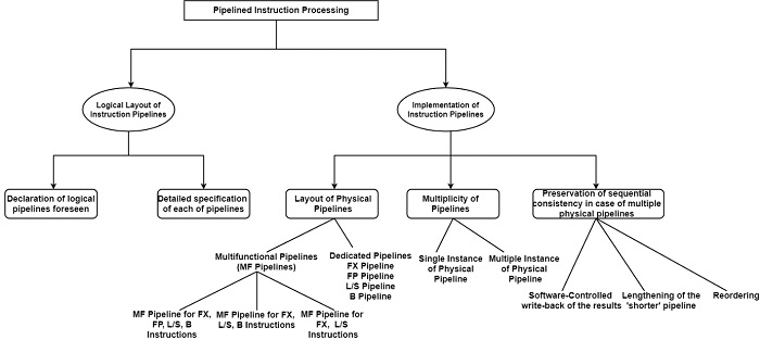 在當前的處理器中,為每個主要的指令類別宣告多個流水線。通常,為 FX 和邏輯資料的處理(稱為 FX 流水線)、FP 資料(FP 流水線)、載入和儲存(L/S 流水線)以及分支(B 流水線)設定獨立的流水線。