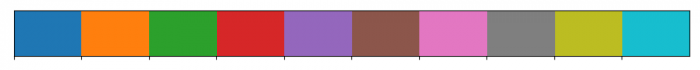 import seaborn as sns from matplotlib import pyplot as plt plt.rcParams["figure.figsize"] = [7.50, 3.50] plt.rcParams["figure.autolayout"] = True current_palette = sns.color_palette() sns.palplot(current_palette) plt.show()
