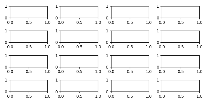 from matplotlib import pyplot as plt plt.rcParams["figure.figsize"] = [7.00, 3.50] plt.rcParams["figure.autolayout"] = True fig2, ax_lst = plt.subplots(4, 4) plt.show()