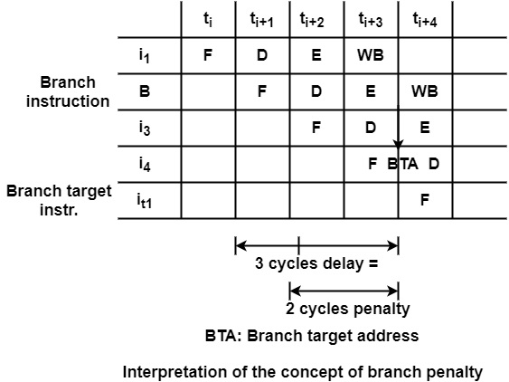 它可以評估和比較不同的分支處理技術,它可能需要一個性能度量。讓我們考慮在一個四級流水線中執行分支指令,如圖所示。如果分支被直接處理,分支目標地址 (BTA) 將在週期 ti+3 計算。