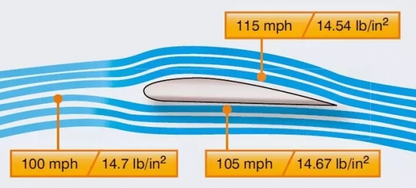 與機翼下表面的空氣相比,上表面的空氣流速更快,從而造成壓力差。當空氣流過彎曲的上表面時,空氣試圖沿直線運動,但翼型的彎曲形狀將其拉回並向下。