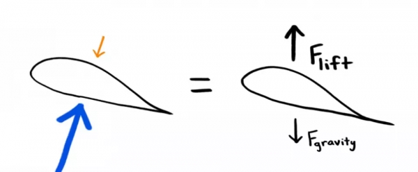 當機翼上下表面之間產生壓力差時,就會產生升力。換句話說,撞擊飛機下表面的空氣分子應該多於上表面。為了達到壓力差,機翼的形狀呈翼型,如下所示(機翼橫截面的側檢視)。