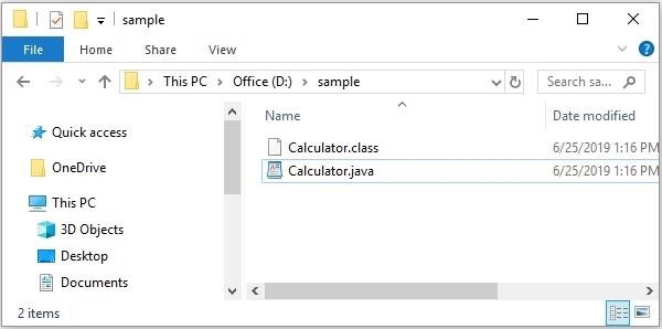 假設我們建立了一個簡單的 Calculator 類,它在名為 Calculator.java 的檔案中添加了兩個或三個數字,路徑為 D:\sample,如下所示: