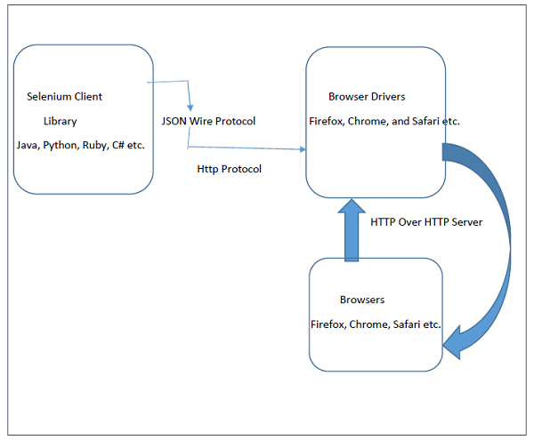 每個瀏覽器都有一個特定的瀏覽器驅動程式。瀏覽器驅動程式與其各自的瀏覽器互動,並透過解釋從瀏覽器接收到的 JSON 來執行命令。瀏覽器驅動程式一旦獲得任何指令,就會在瀏覽器上執行它們。然後,響應將以 HTTP 響應的形式返回。