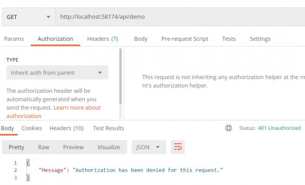 }由於我們在操作方法上添加了 authorize 屬性,因此應使用適當的授權(如 bearer 令牌、API 金鑰、OAuth 等)來訪問操作方法。未經授權的訪問將導致 **401 未授權** 響應,如下所示。