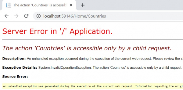 子操作只能透過子請求訪問。它不會響應 URL 請求。如果嘗試這樣做,將引發一條執行時錯誤,說明 - 子操作只能透過子請求訪問。可以使用操作() 和 RenderAction() html 幫助程式,透過從檢視發出子請求來呼叫子操作方法。